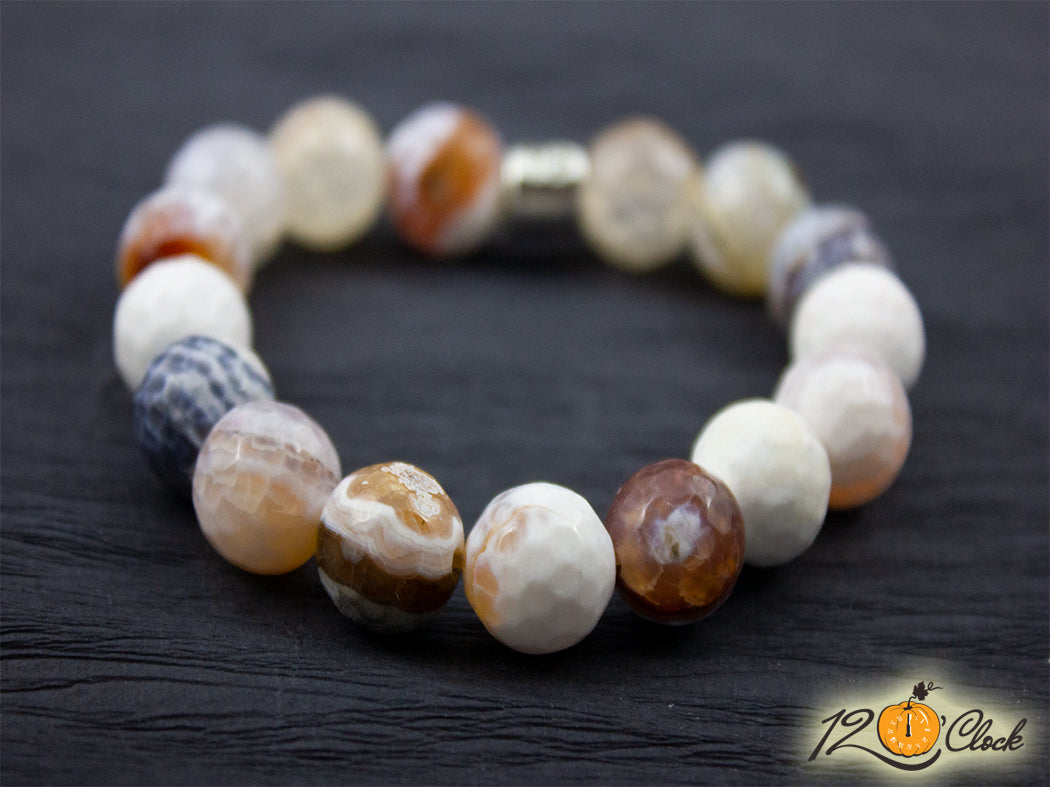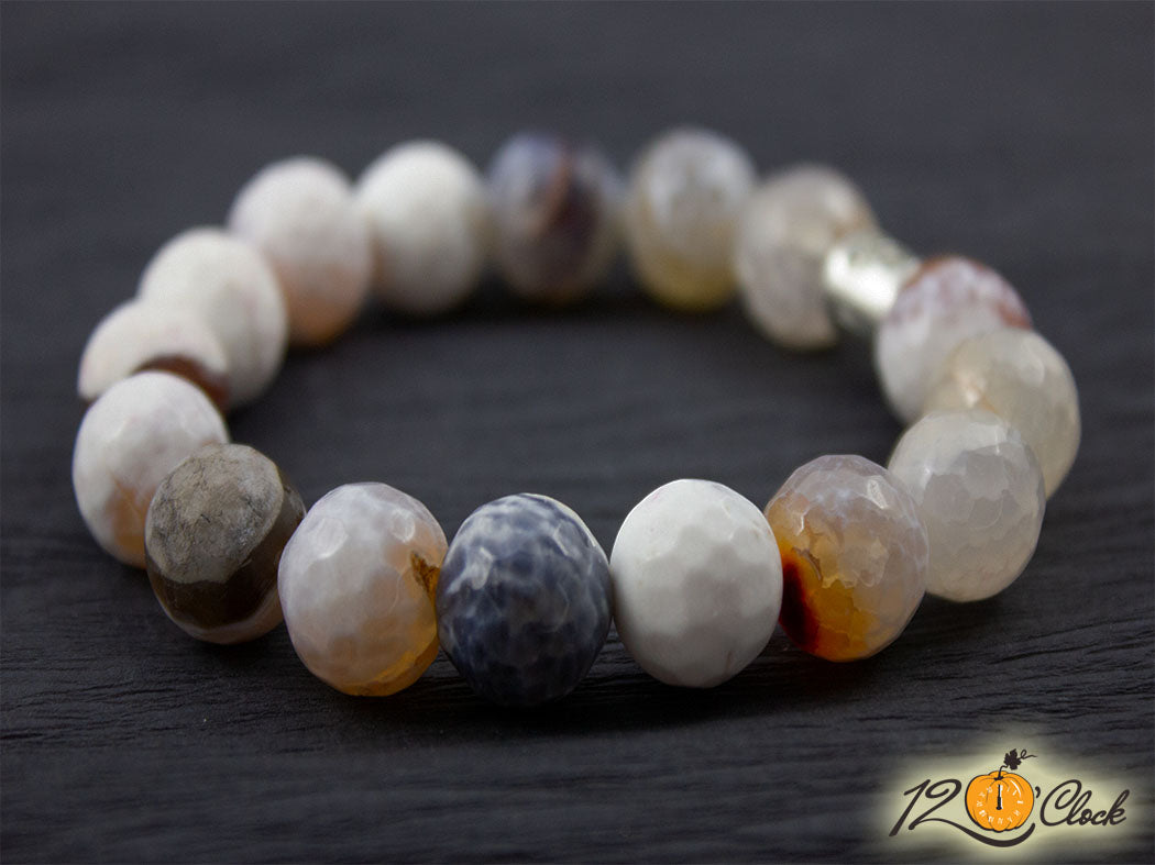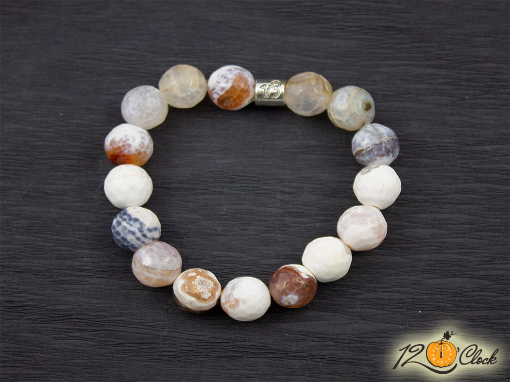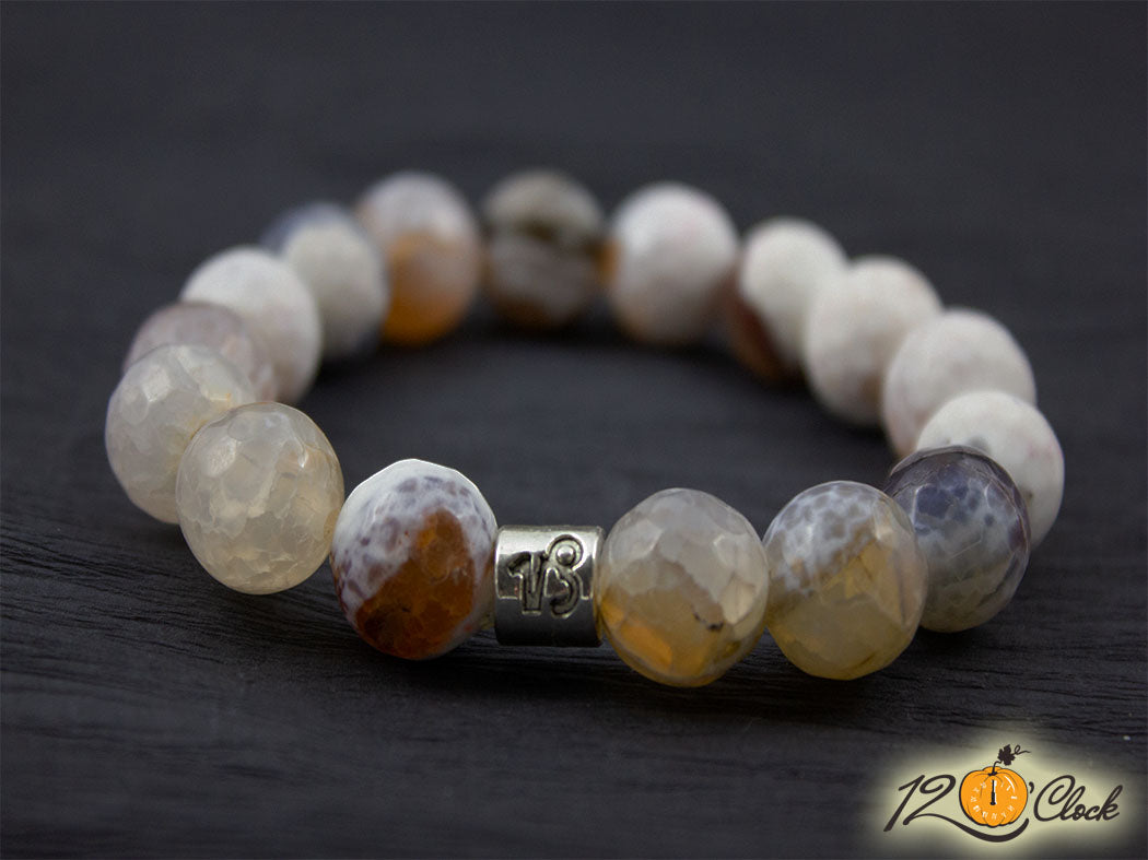 Ръчно изработена гривна с основа еластична корда, зодия и камъни в комбинация от бяло-кафяв драконов ахат 12мм