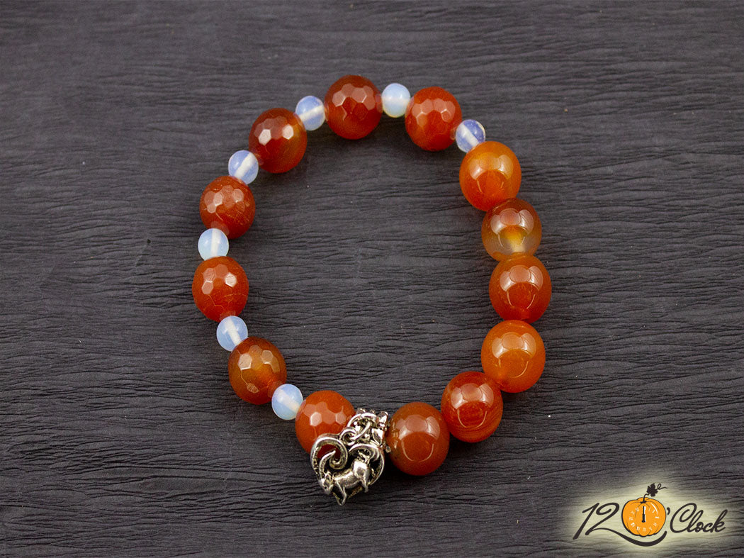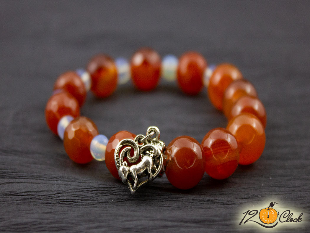 Ръчно изработена гривна с основа еластична корда, зодия и камъни в комбинация от оранжев фасетиран ахат 12мм, оранжев ахат 12мм и лунен камък 6мм