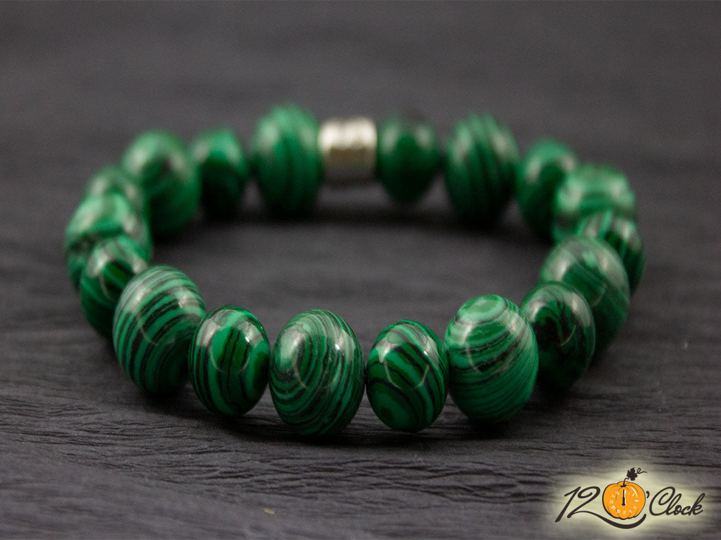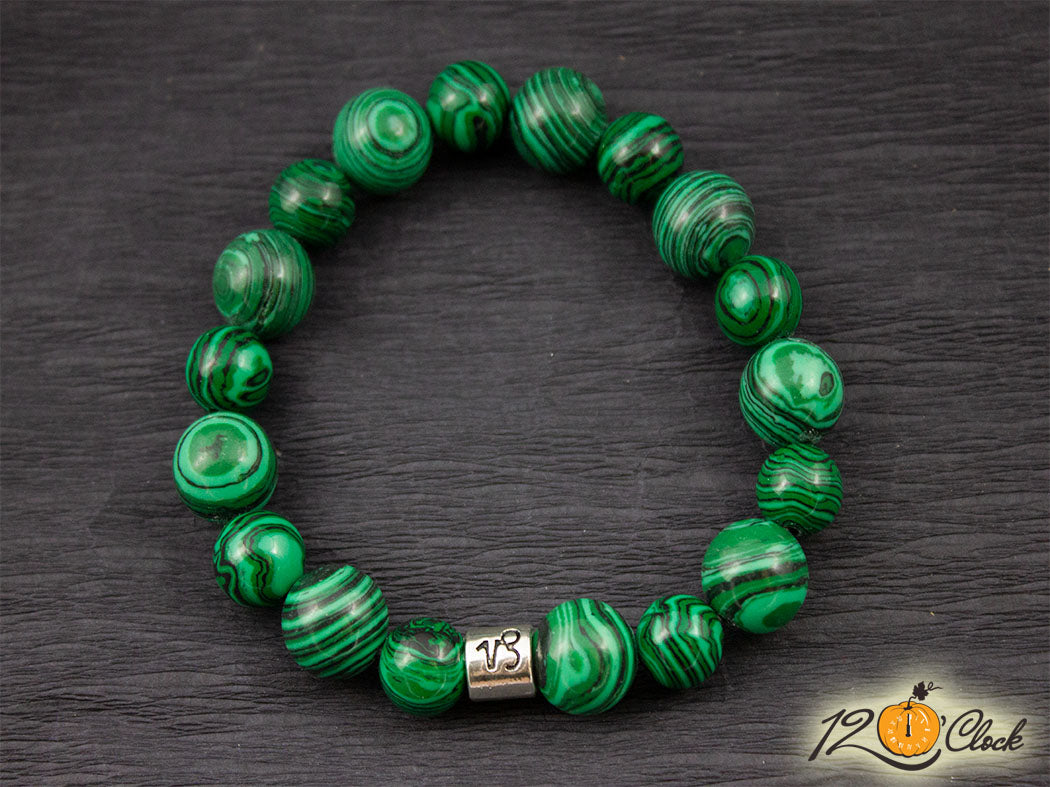 Ръчно изработена гривна с основа еластична корда, зодия и камъни от малахит в два размера: 10мм и 12мм