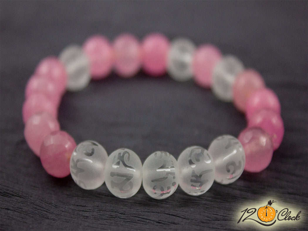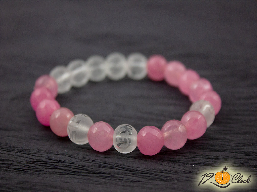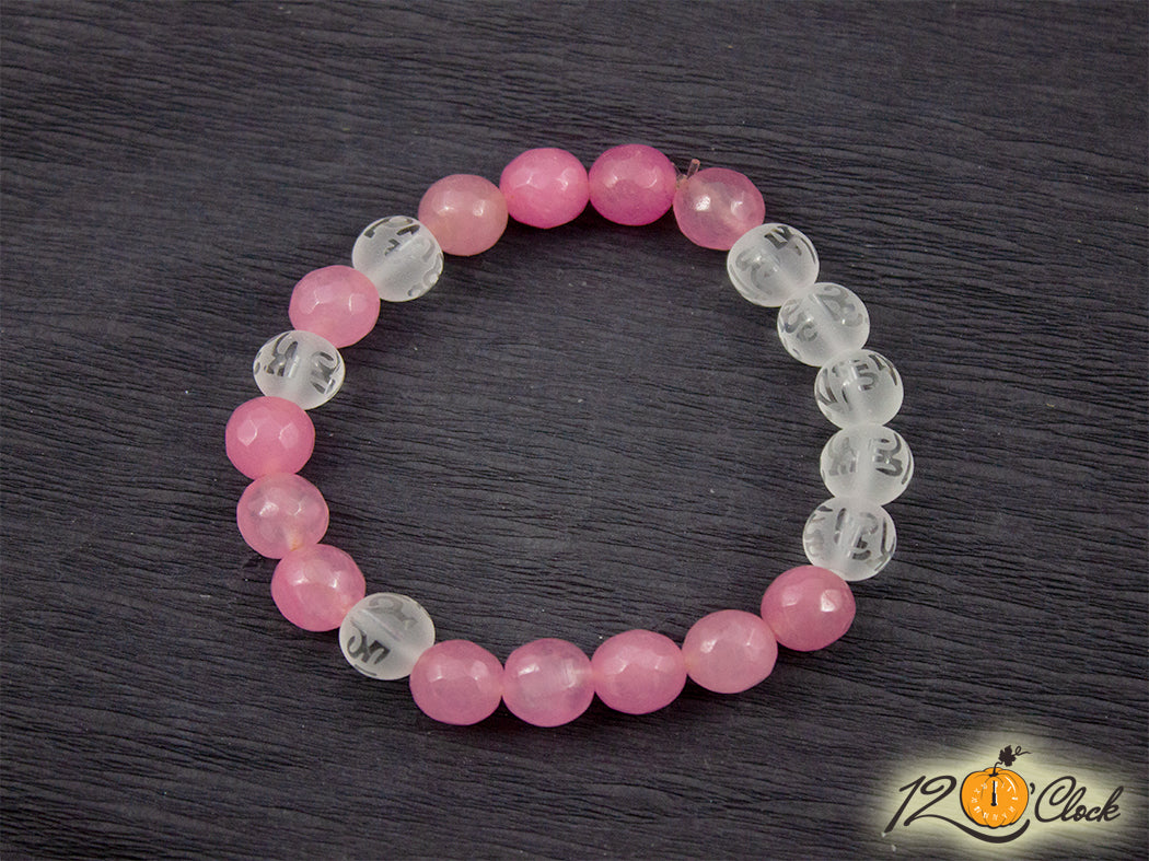 Ръчно изработена гривна с основа еластична корда и камъни от розов фасетиран кварц 10мм и планински кристал мат с йероглифи 10мм