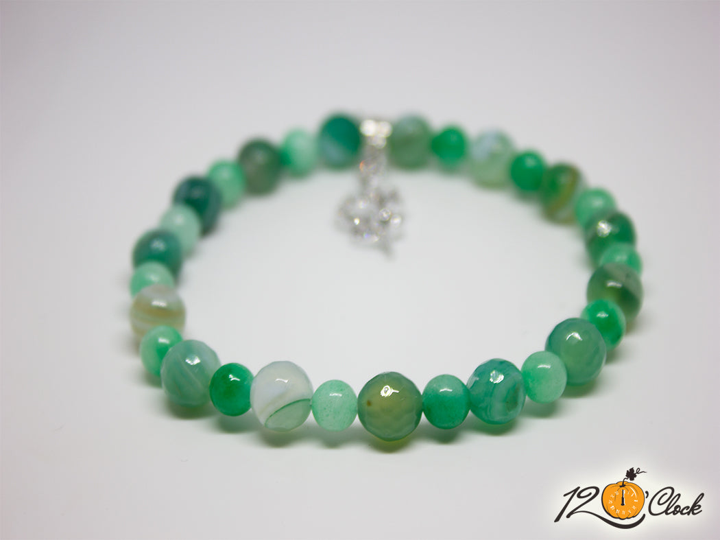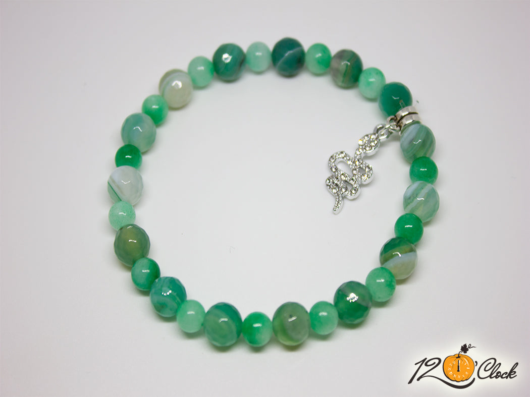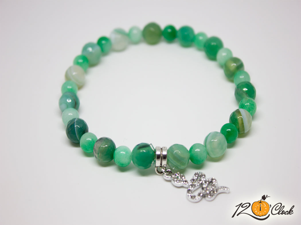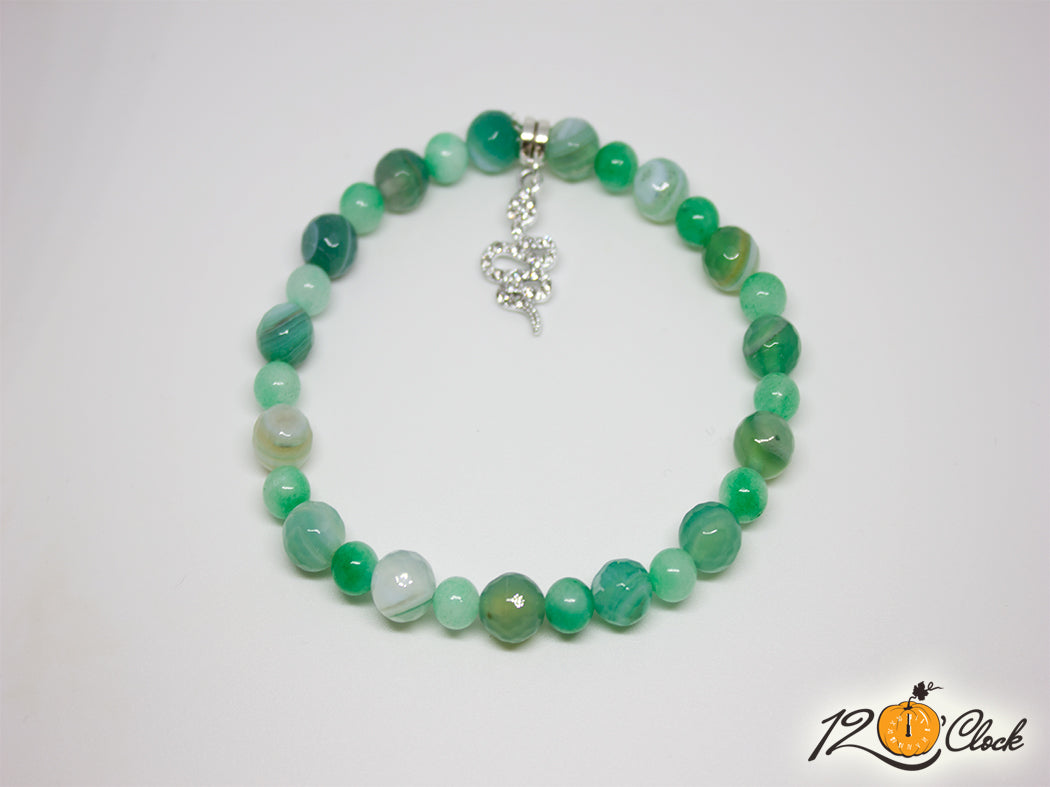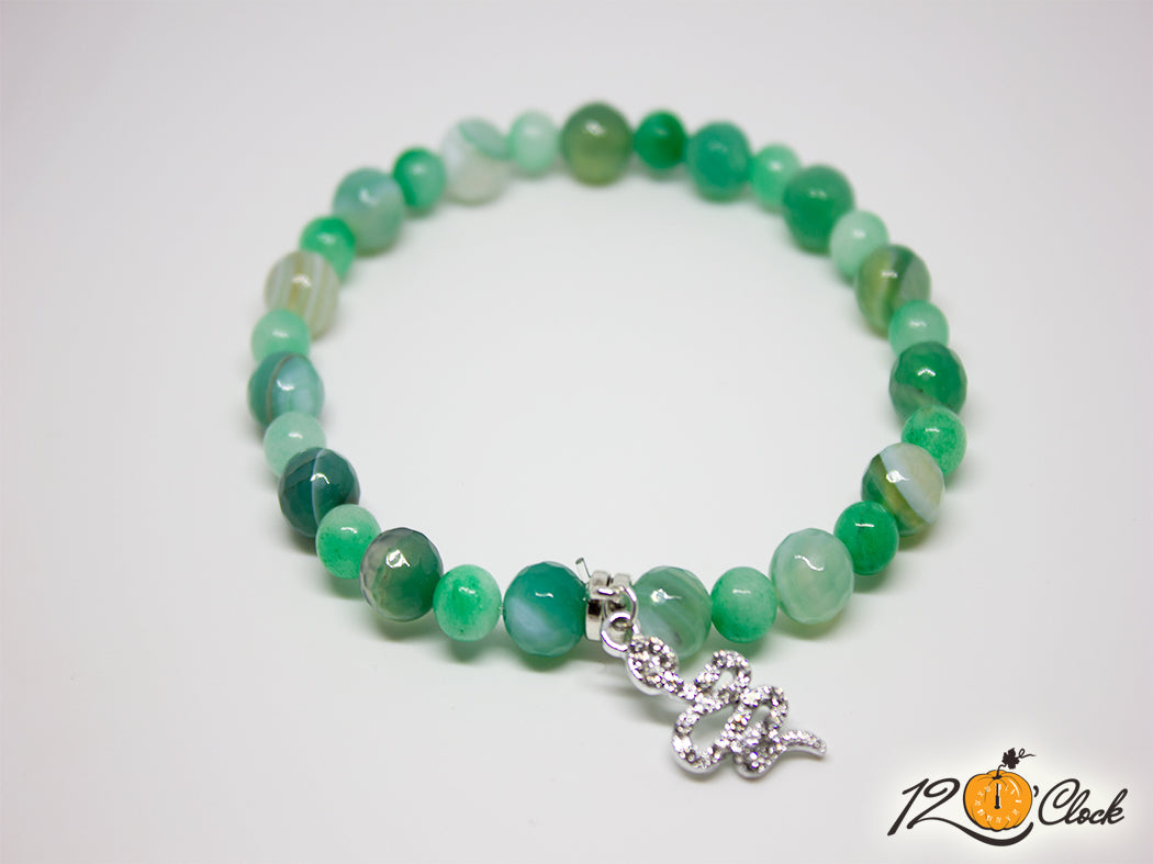 Ръчно изработена гривна от еластична корда, с разделител, халка, символ на змия и камъни от зелен ахат в два размера 6мм и 8мм.