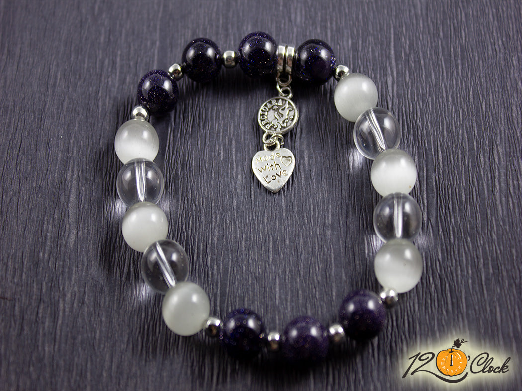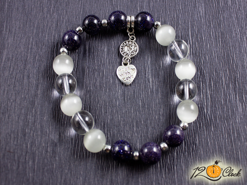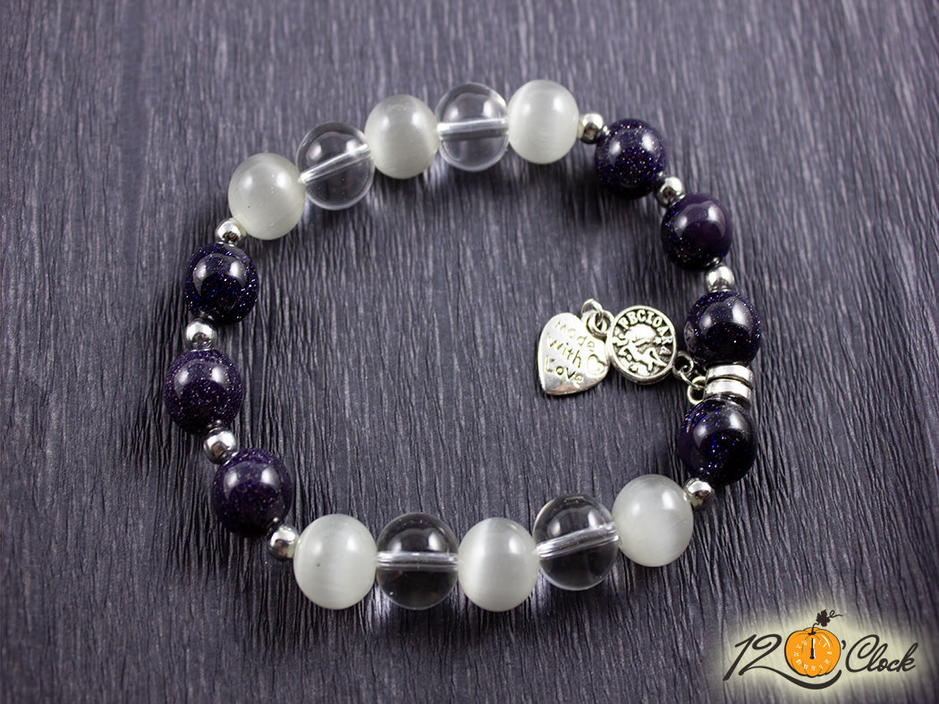 Ръчно изработена гривна от еластична корда, метални топчета, разделител, халка, сърце и зодия, в комбинация от слънчев камък 10 мм, светло сиво котешко око 10 мм и планински кристал 10 мм.